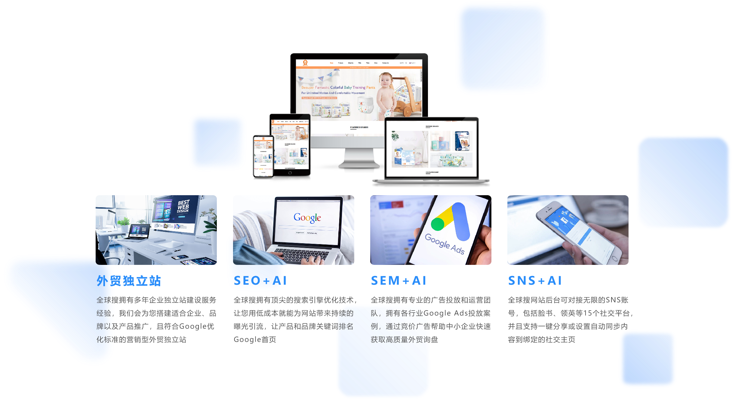 品牌化离不开海外推广,随着互联网时代的发展,线上营销成为必争之地。全球搜也将继续整合独立站线上营销优势资源和Google认证的前沿优化推广技术,帮助更多外贸企业抢占海外市场!