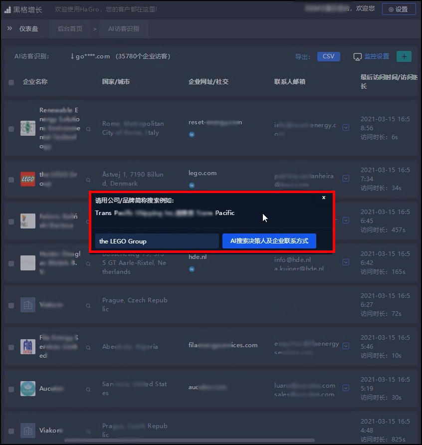 AI访客识别:而黑格增长的【AI访客识别】则是将独立站访客数据进行放大,识别出每一个访问独立站的企业访客,同时获取企业访客的信息,包含企业名称、企业官网、企业社交主页、企业联系人邮箱等重要数据。