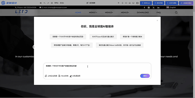 传统的建站模式往往周期长、维护难。全球搜V8.0引入了AI建站智能体,彻底升级了独立站的创建与内容生产模式。